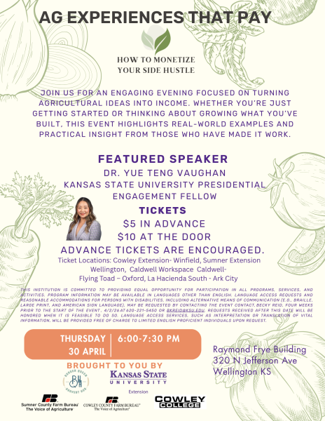 This institution is committed to providing equal opportunity for participation in all programs, services, and activities. Program information may be available in languages other than English. Language access requests and reasonable accommodations for persons with disabilities, including alternative means of communication (e.g., Braille, large print, and American Sign Language), may be requested by contacting the event contact, Becky Reid, four weeks prior to the start of the event , 4/2/26 at 620-221-5450 or bkreid@ksu.edu. Requests received after this date will be honored when it is feasible to do so. Language access services, such as interpretation or translation of vital information, will be provided free of charge to limited English proficient individuals upon request.